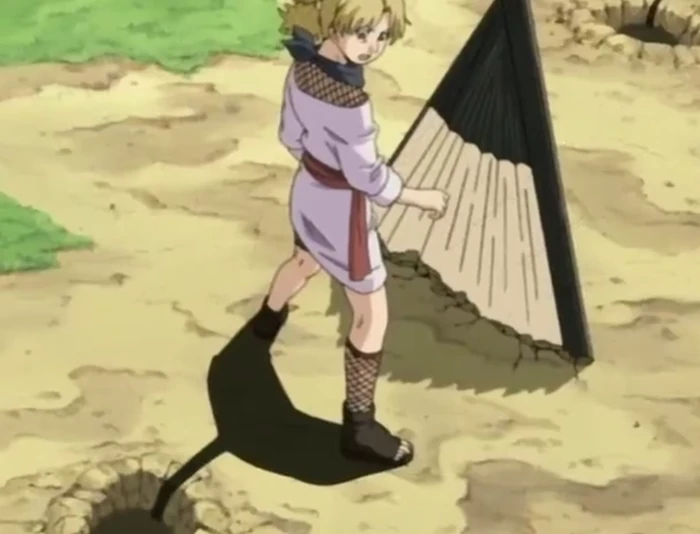 When Temari readies her final attack, Shikamaru finally activates Shadow Possession Jutsu (Kagemane no Jutsu). She blocks the direct path, thinking herself safe — but she never saw the trench and debris beneath her feet.