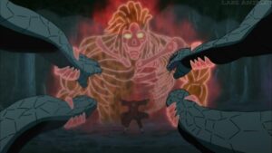 Memories of Rock Lee’s astonishing taijutsu during earlier matches flash through Sasuke’s mind. With no other choice, Sasuke adapts. He stops resisting and uses momentum to break Yoroi’s grip, shifting entirely to taijutsu to even the odds.